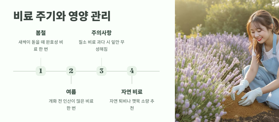 라벤더는 척박한 땅에서도 잘 자라는 강인한 식물입니다. 봄철 새싹이 돋을 때 완효성 비료를 한 번, 여름 개화 전에 인산이 많은 비료를 한 번 주면 충분해요.