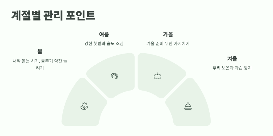 봄에는 새싹이 돋는 시기라 물주기를 조금 늘려주고, 여름에는 강한 햇볕과 습도를 조심해야 합니다. 가을에는 겨울 준비를 위한 가지치기를, 겨울에는 뿌리 보온과 과습 방지에 신경 써주세요.