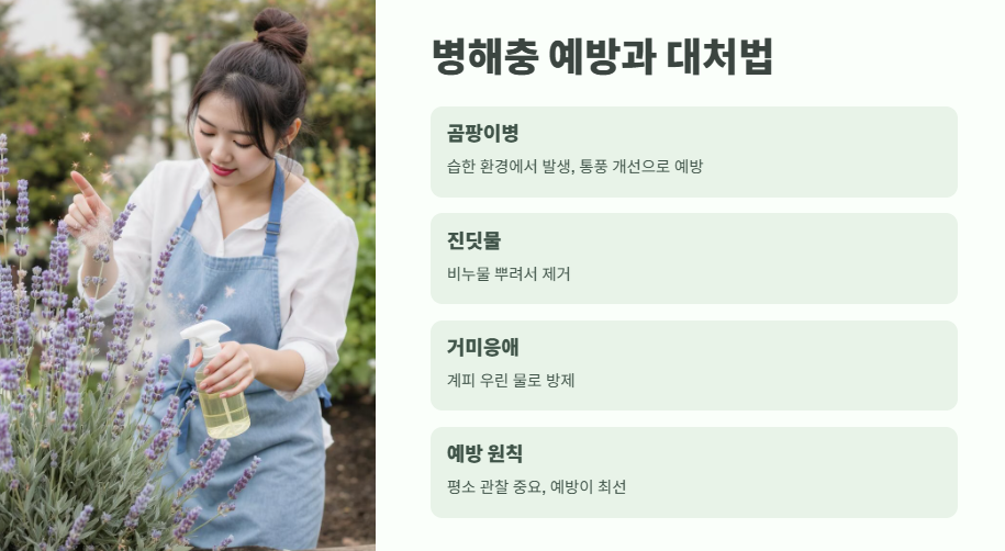 라벤더는 비교적 병해충에 강한 편이지만, 습한 환경에서는 곰팡이 병이 생길 수 있습니다. 통풍을 좋게 하고 물을 줄 때 잎에 닿지 않게 주의하세요.