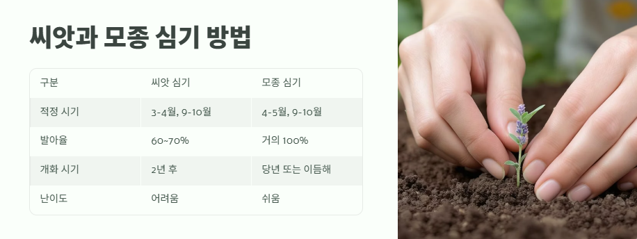 | 파종 방법 | 씨앗 심기 | 모종 심기 |